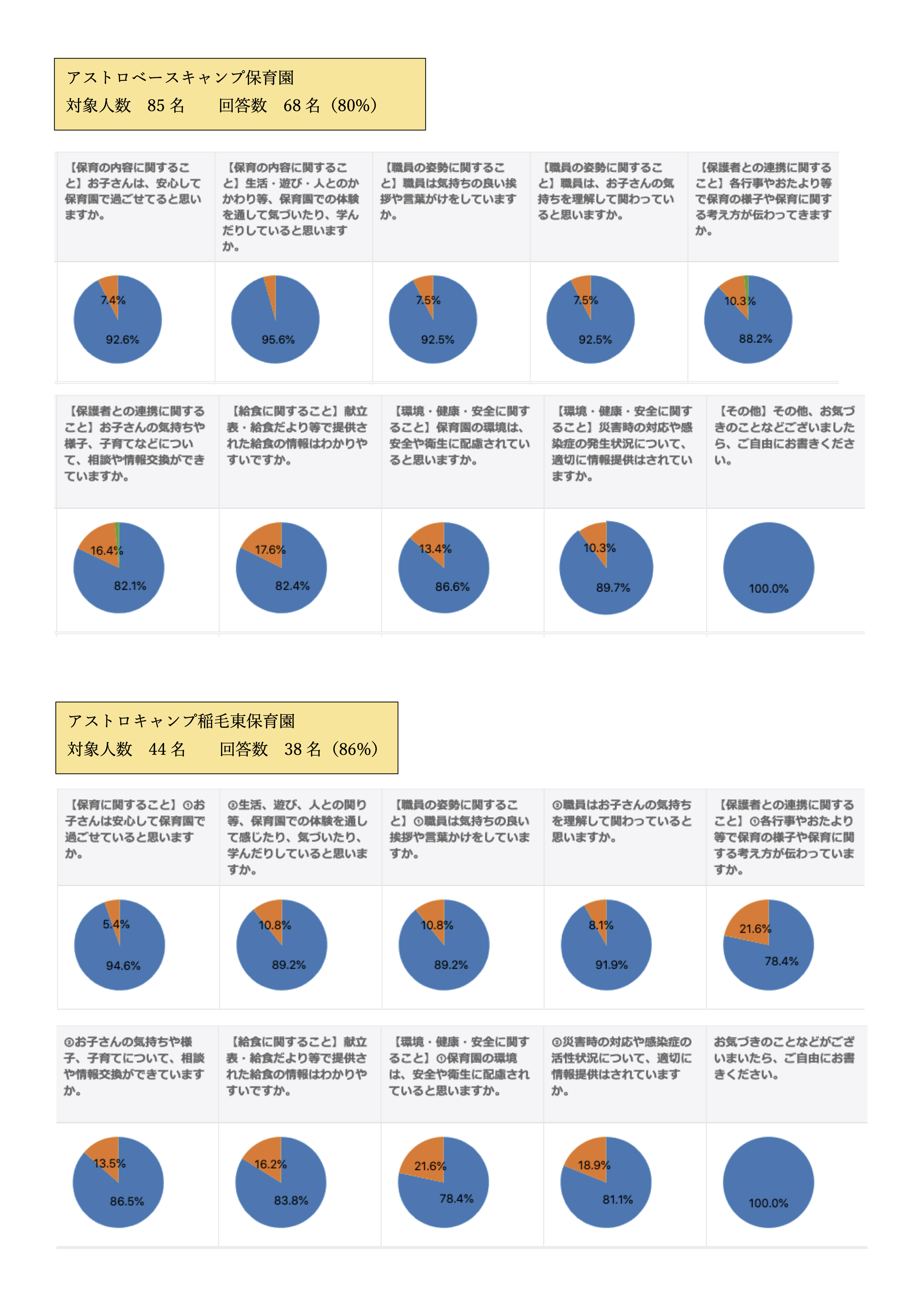 令和2年度のアストロベースキャンプ保育園、アストロキャンプ稲毛東保育園に関するアンケート結果を画像にて公表致します。