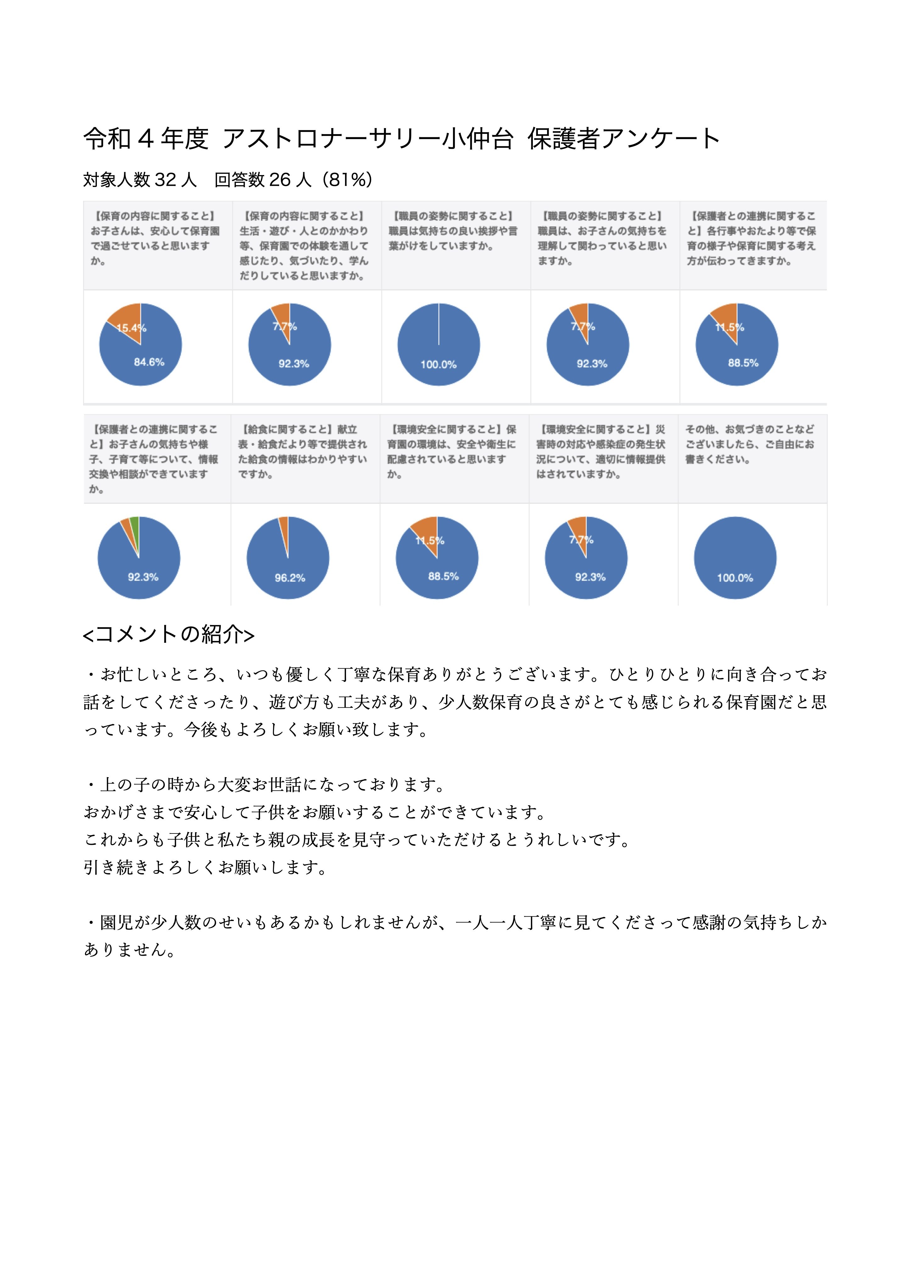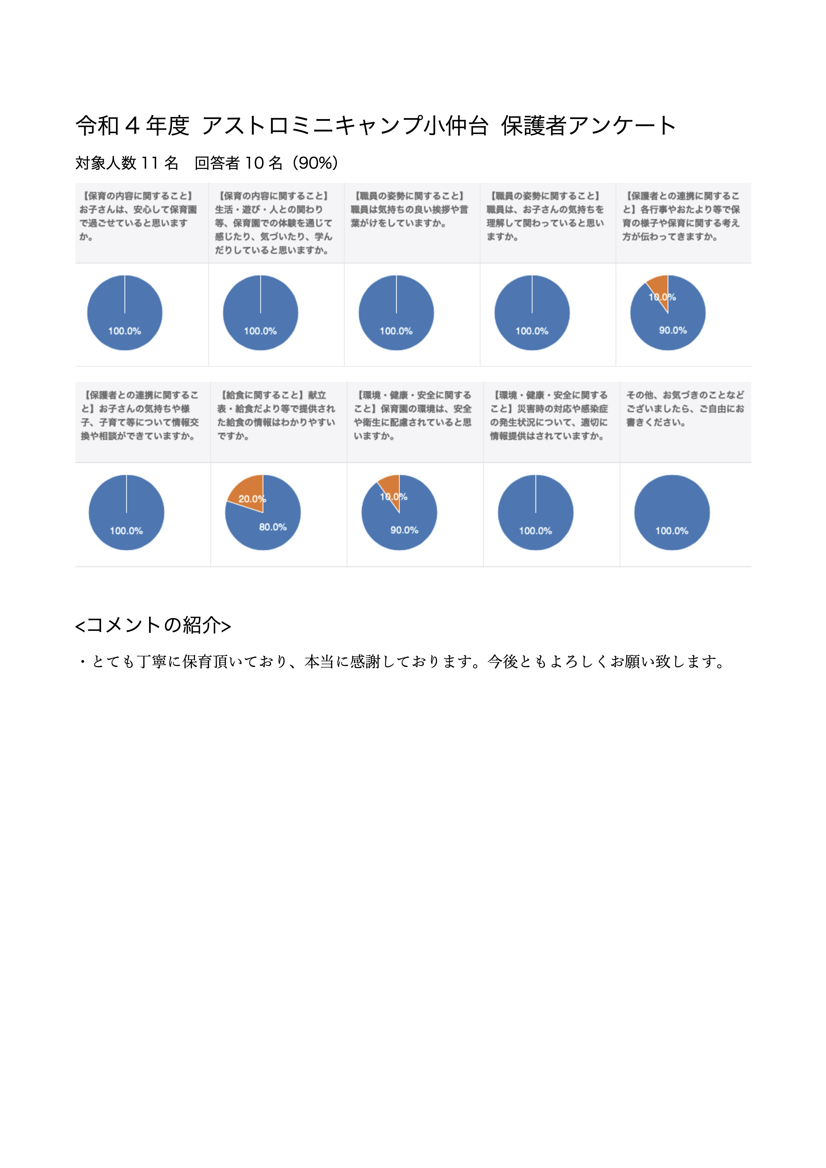 令和4年度のアストロミニキャンプ小仲台の保育に関するアンケート結果を公表致します。 お忙しい中お答え頂き誠にありがとうございました。 お答え頂いた結果をもとにこれからも保育園全体の質の向上に努めて参ります。 どうぞよろしくお願い申し上げます。