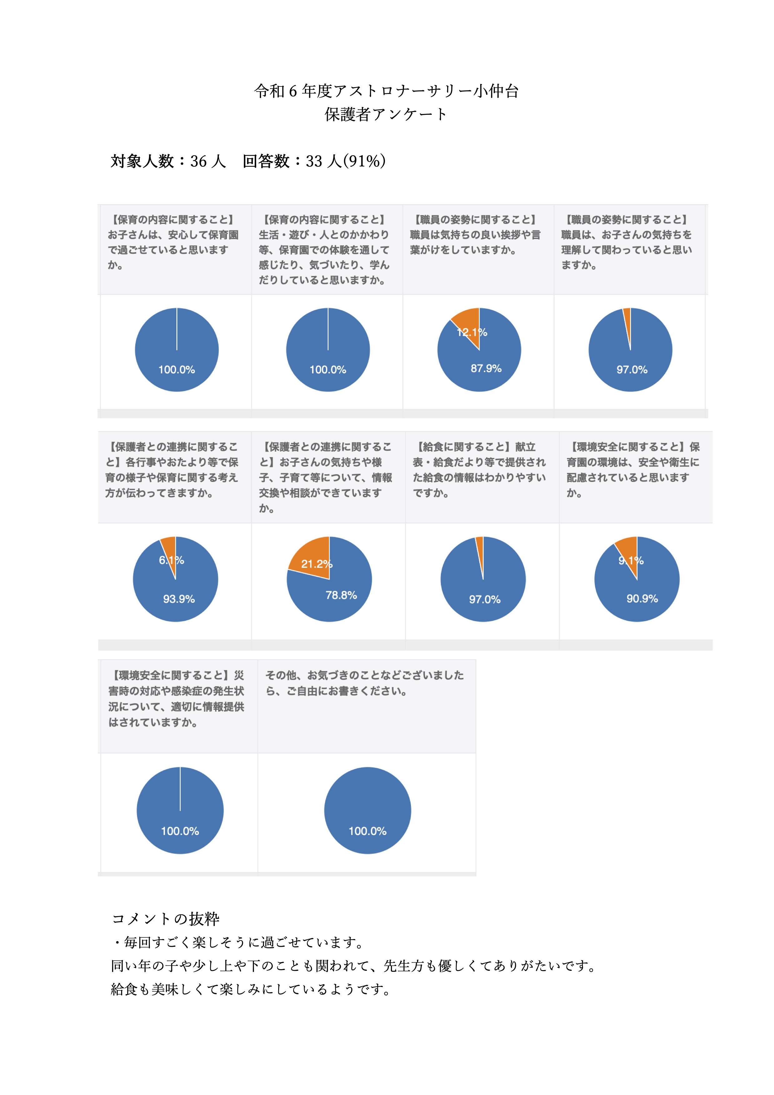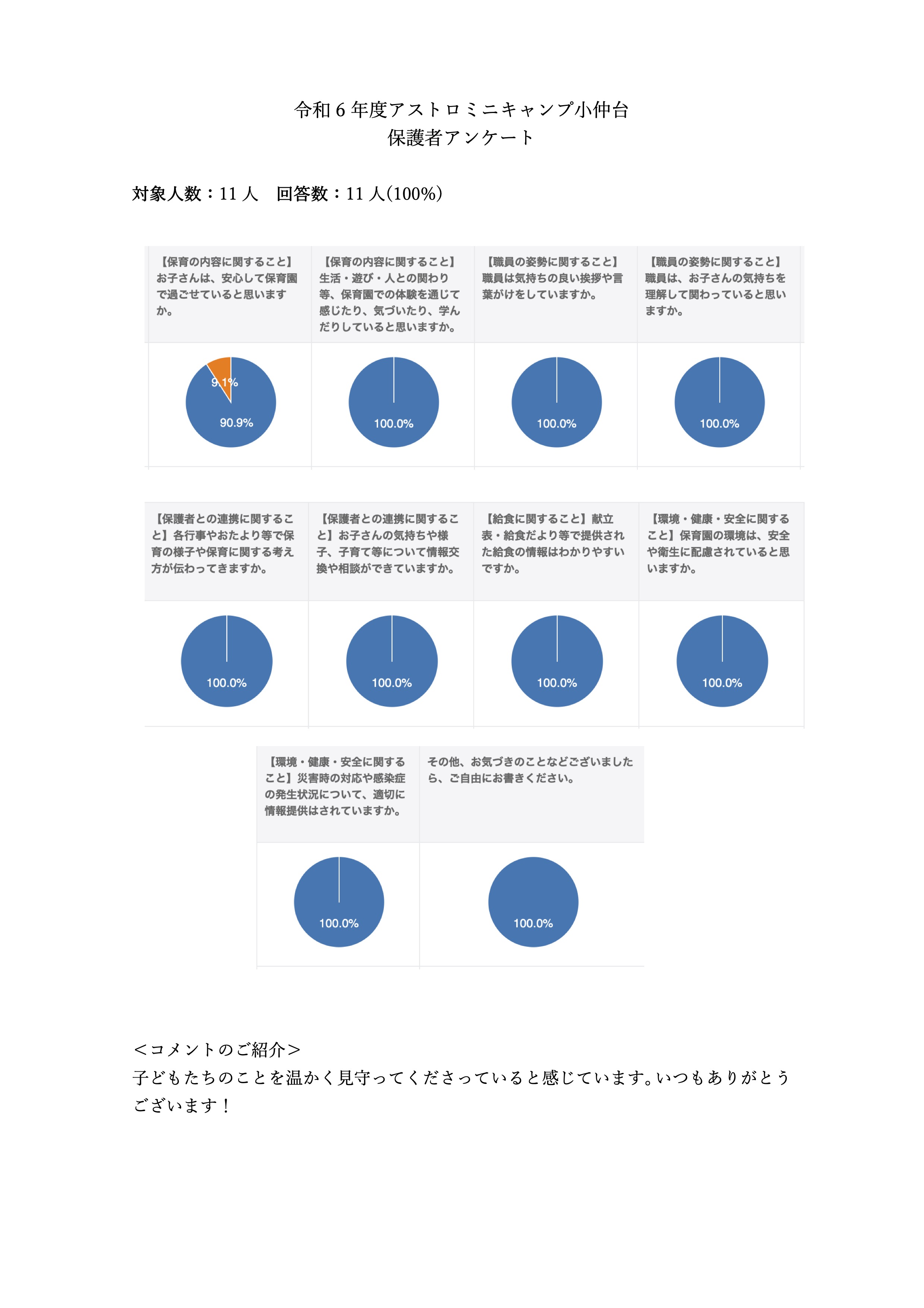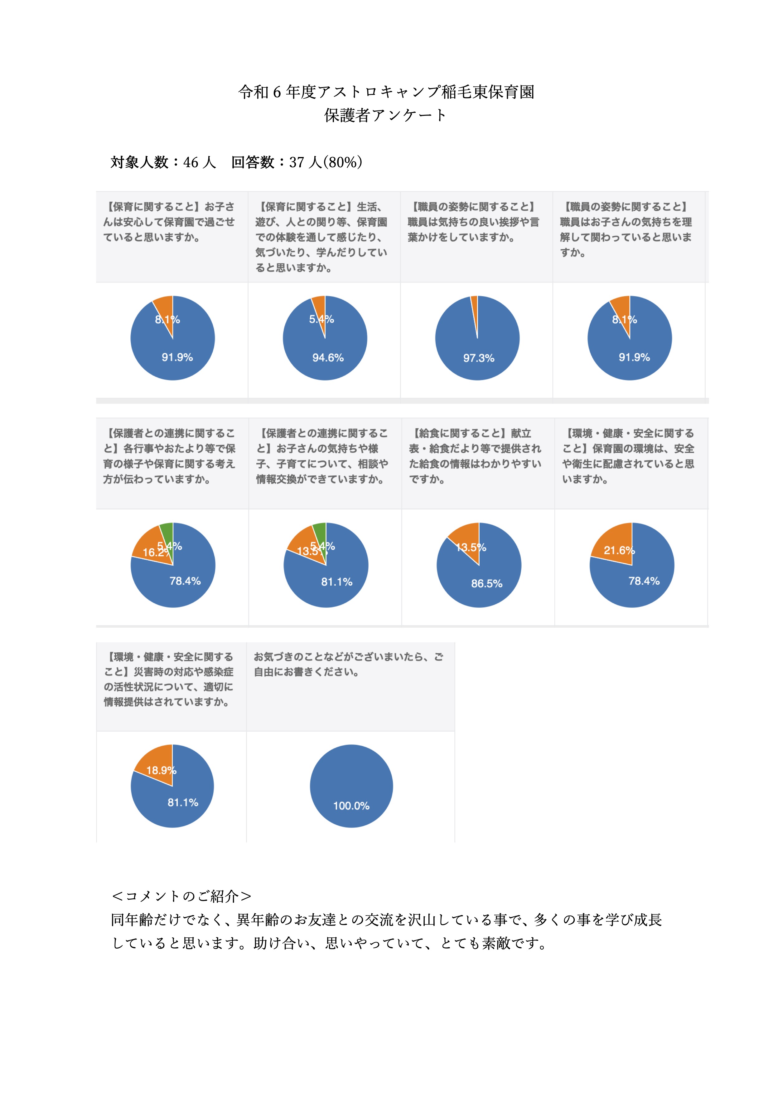 令和6年度のアストロミニキャンプ小仲台の保育に関するアンケート結果を公表致します。 お忙しい中お答え頂き誠にありがとうございました。 お答え頂いた結果をもとにこれからも保育園全体の質の向上に努めて参ります。 どうぞよろしくお願い申し上げます。